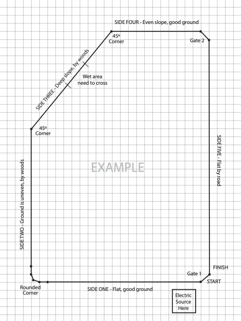 Draw a rough outline of the area you want to fence. Include property boundaries, buildings, trees, and any obstacles.